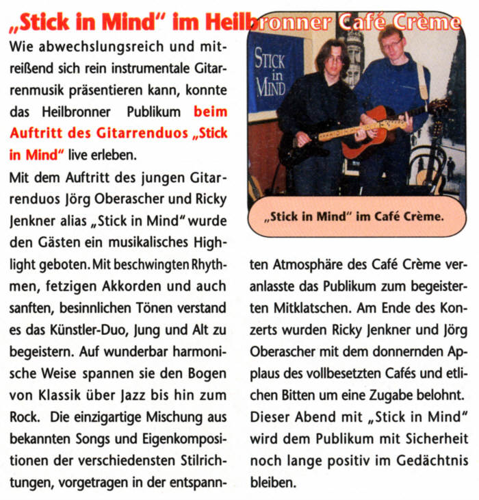 Der Mai 2001 bescherte uns ein unvergessliches Konzert in einem Heilbronner Café. Moritz - Das Stadtmagazin, Mai 2001 |