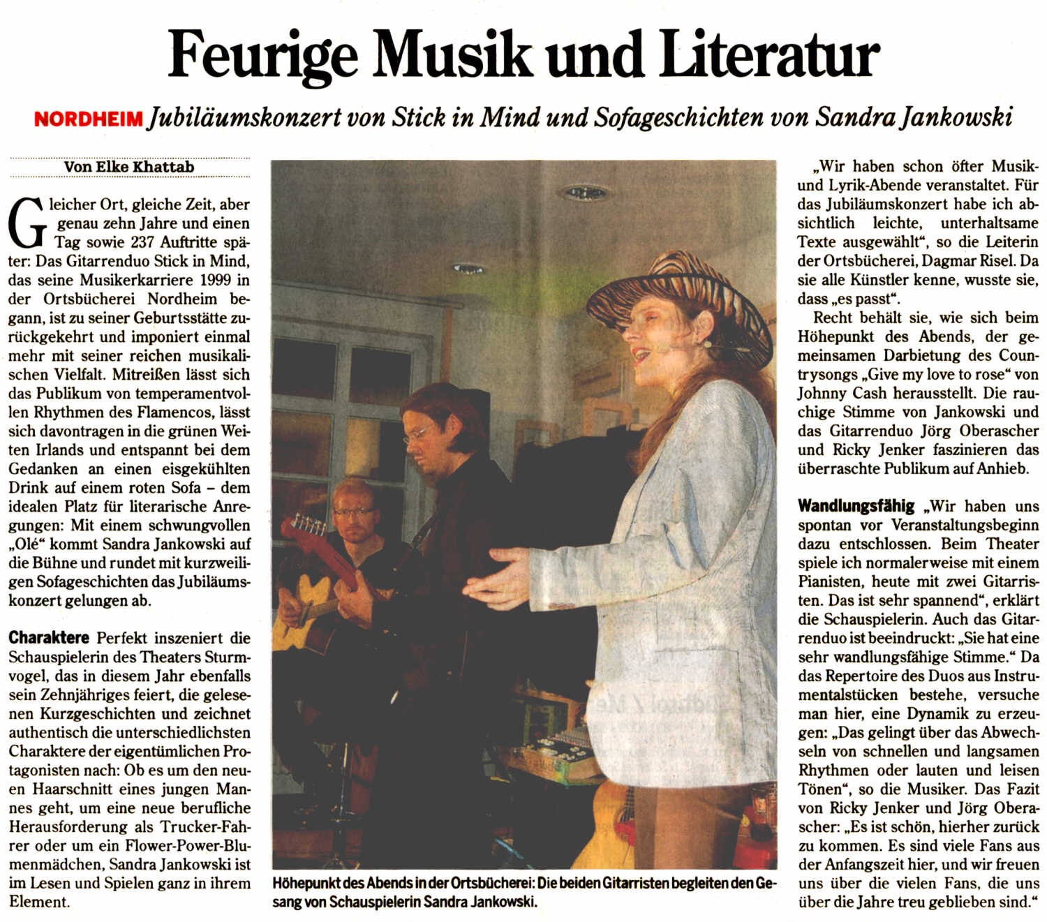 Wie gut Instrumentalmusik von STICK in MIND mit Literatur harmonieren kann, konnte das begeisterte Publikum im November bei einem weiteren Moritatenabend mit Günter Menz erleben Heilbronner Stimme, 23.11.2005