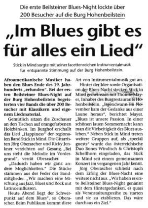 Mit Vernissagen, einem Ausflug an die österreichische Grenze und Konzerten in unserem "Wohnzimmer" der Burg Hohenbeilstein begann das Jubiläumsjahr 2009 von STICK in MIND. Heilbronner Stimme |