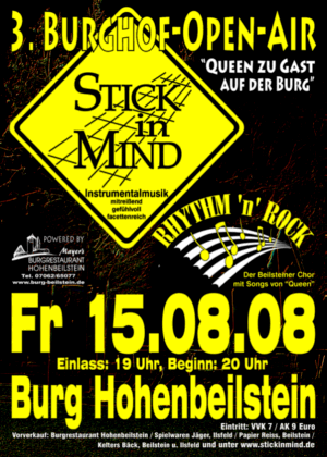 Es folgten verschiedene Auftritte und Konzerte bei Festen, in Restaurants und Open-Air von Baden übers Kraichgau bis ins Schwäbische. Wie auch 2007 ragte das Konzert in der Alten Aula in Heidelberg mit der unvergleichlichen Ausstrahlung dieses Saals heraus. Im Sommer 2008 luden wir dann zum 3. Beilsteiner Burghof-Open-Air ein. Unter dem Motto "Queen zu Gast auf der Burg" präsentierten wir zusammen mit einem Beilsteiner Chor Songs der Rock-Monumente Queen. |